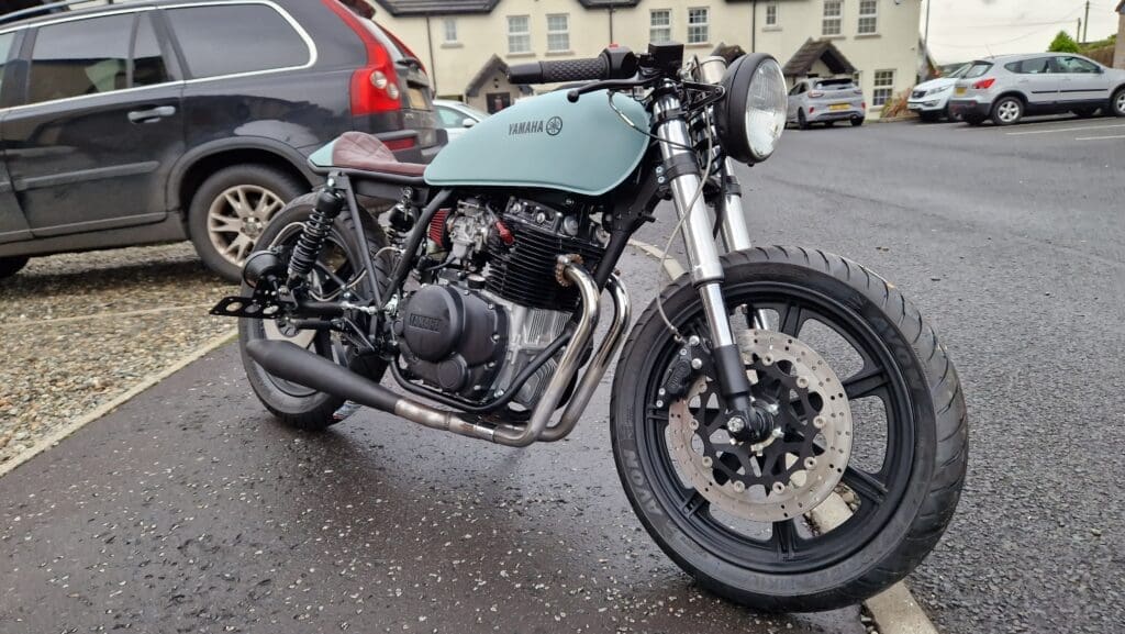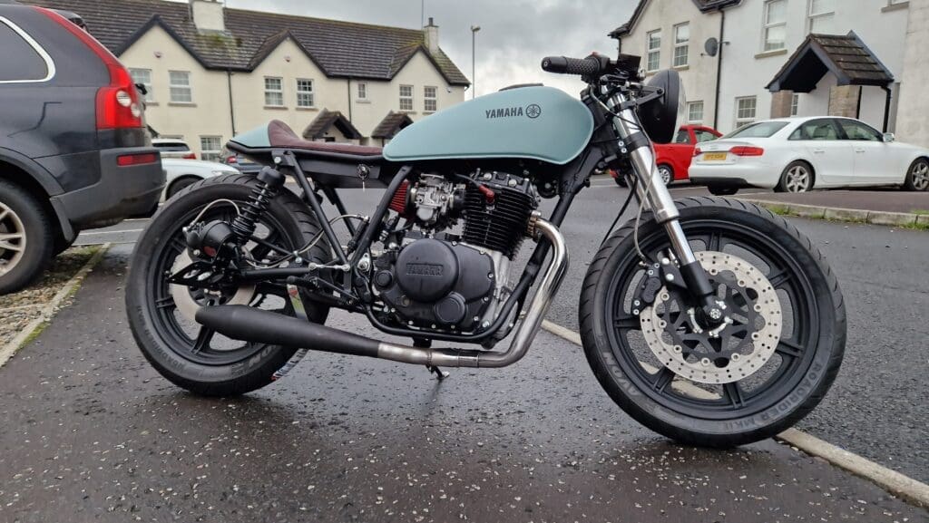 YAMAHA XS400 US CUSTOM, Aprilia RS 125 front forks , disc and caliper, 16″ to 18″ rear wheel change for the looks. Custom made seat unit and electric tray , rear seat hoop also welded in, lots of other custom made brackets, rear sets find themselves back where the pillion foot rests set. New wiring with the help of the nwtcycletronic X21. Matt paint used throughout.