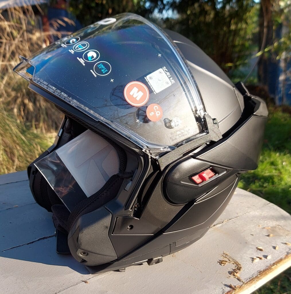 With the chin-guard lifted, you get all the visibility and air-flow of a classic open-face helmet, plus a drop-down sun-visor to take the edge off the glare, and there’s a “P/J Lock” button that locks it back so that it can’t suddenly, during hard braking say, flip forwards obscuring your vision. And, with the ‘guard down, it locks in place to become a very safe full-face helmet for bad weather or higher speeds. The interior, like all good helmets these days, is removable and washable (who actually does that?), and there’re a number of included variants of cheek pads to get a perfect fit. There’re pockets for intercom system speakers so you can listen to music, or have the nice sat-nav lady on your phone talk to you, if you have a suitable head-unit. Once on it’s a comfortable fit (although at the time of writing I’ve yet to wear it on the bike cos it’s been absolutely feckin’ freezing since the beginning of the year), and the flip-release button’s easy to get to with gloves on, as is the sun-visor (which has five positions to help you keep the perfect view ahead), and the strap release.