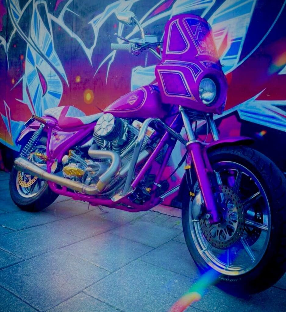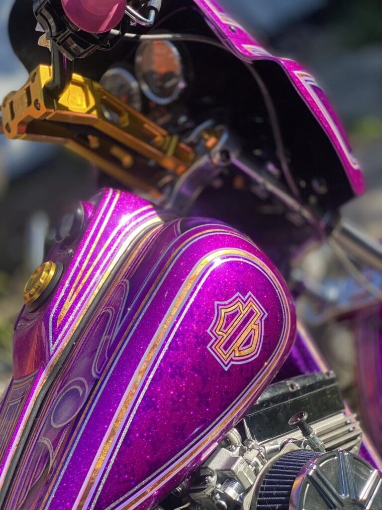 The pink paint is a show stopper. Glitter and more glitter lol. Custom aluminum swingarm, Bitturbo shocks and drop ins chrome powder coat wheels, custom seat and bar pad. Tuned and goes like stink.