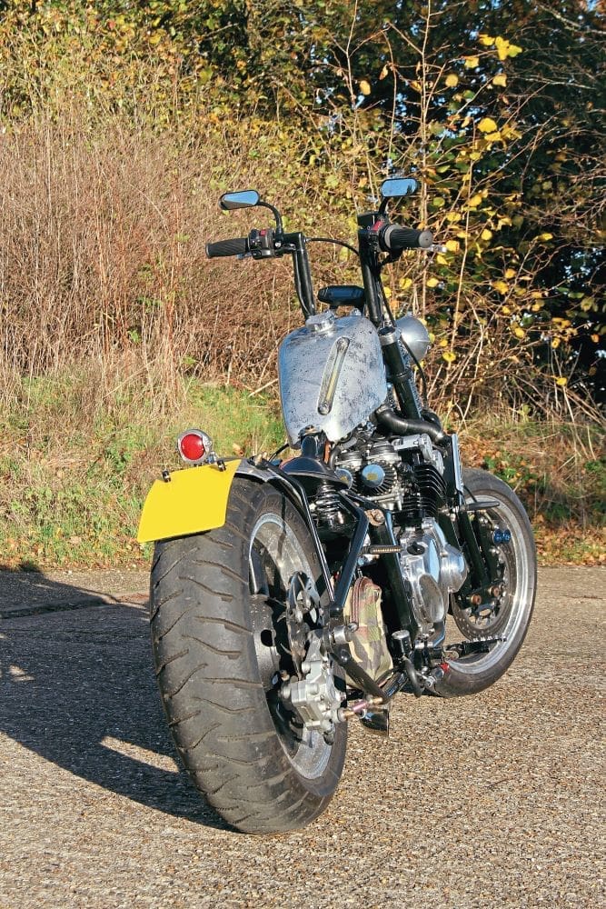 He put the original frame in the jig, cut the two upper top tubes from the headstock away, and made a new single tube spine section so that a custom tank could be fitted, and then cut away the rear framework behind the rear of the engine cradle, leaving most of the cradle itself intact, and made a new hardtail section to take the stock rear wheel n’ brake, making all the necessary gussets and braces by hand. “I really enjoy welding frames and stuff… until you burn your fingers – then it’s OUCH! F**K! BASTARD THING!”